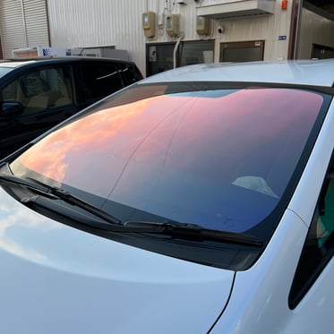 青紫~ローズレッド発色 主にフロントガラス用。どの角度からでも何かしら発色する為、青系発色では難しかったガラスが寝ている(地面に平行に近い)お車でも発色を楽しむ事ができます。透過率が低い為、UV表記があるガラスには保安基準内での施工は難しいです。